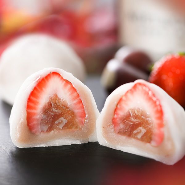 濃厚な栗の味わいにシャンパンの華やかさが香り、いちごの甘酸っぱさがバランスよく調和する、シャンパンいちご大福“マローネ”。